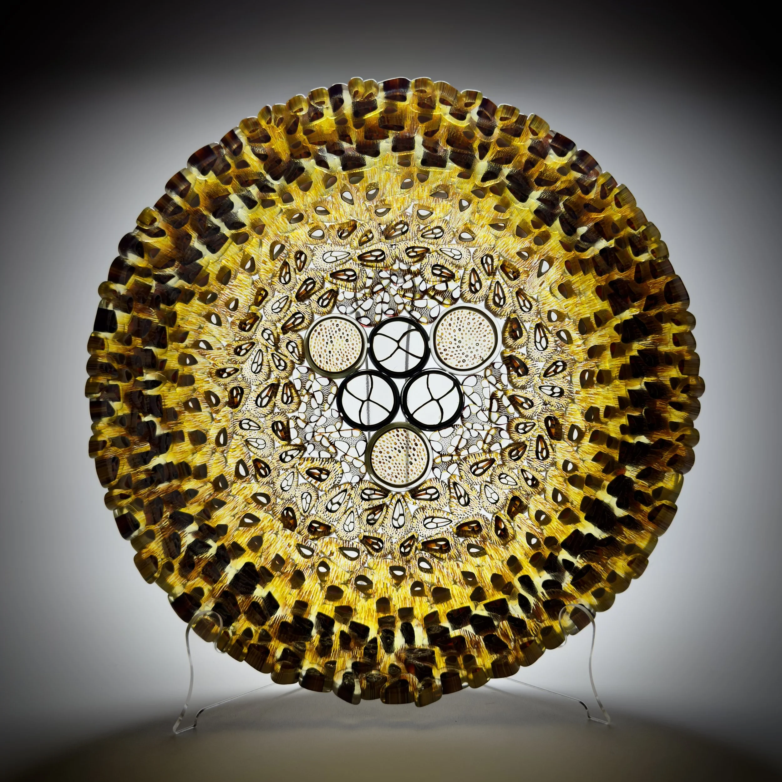 Sunfire Mandala glows with the warm tones of amber and gold, each Murrini slice forming part of its intricate circular design. In the right light, it casts delicate patterned shadows that bring an extra layer of beauty to its surroundings. Whether on a stand or resting as a bowl, it stands out as a refined focal point in any space.